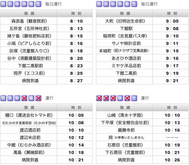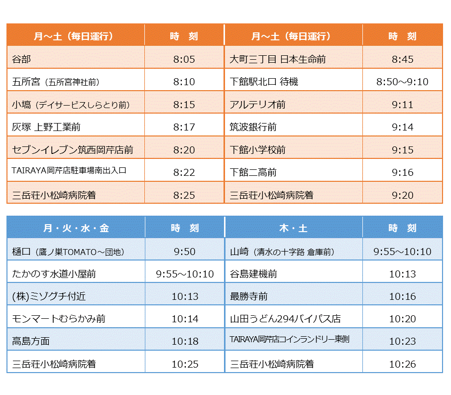 外来のお帰りの際は、下館駅北口までお送りしていますので、医事課受付または運転手にお声掛けください。